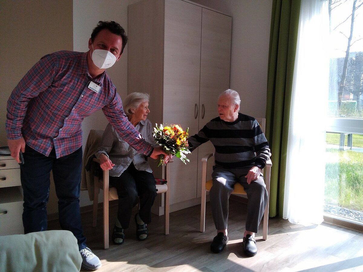 Am Sonntag den 27. März 2022 feierten Sophie und Wilhelm Schmidt ihren 68. Hochzeitstag in der Senioren-Residenz Bönen-Königsborn, auch nach dieser langen Zeit sind sie immer noch so verliebt wie am ersten Tag. Einrichtungsleiter Krystian Thomann gratulierte dem Ehepaar mit einem Frühlings-Blumenstrauß.
