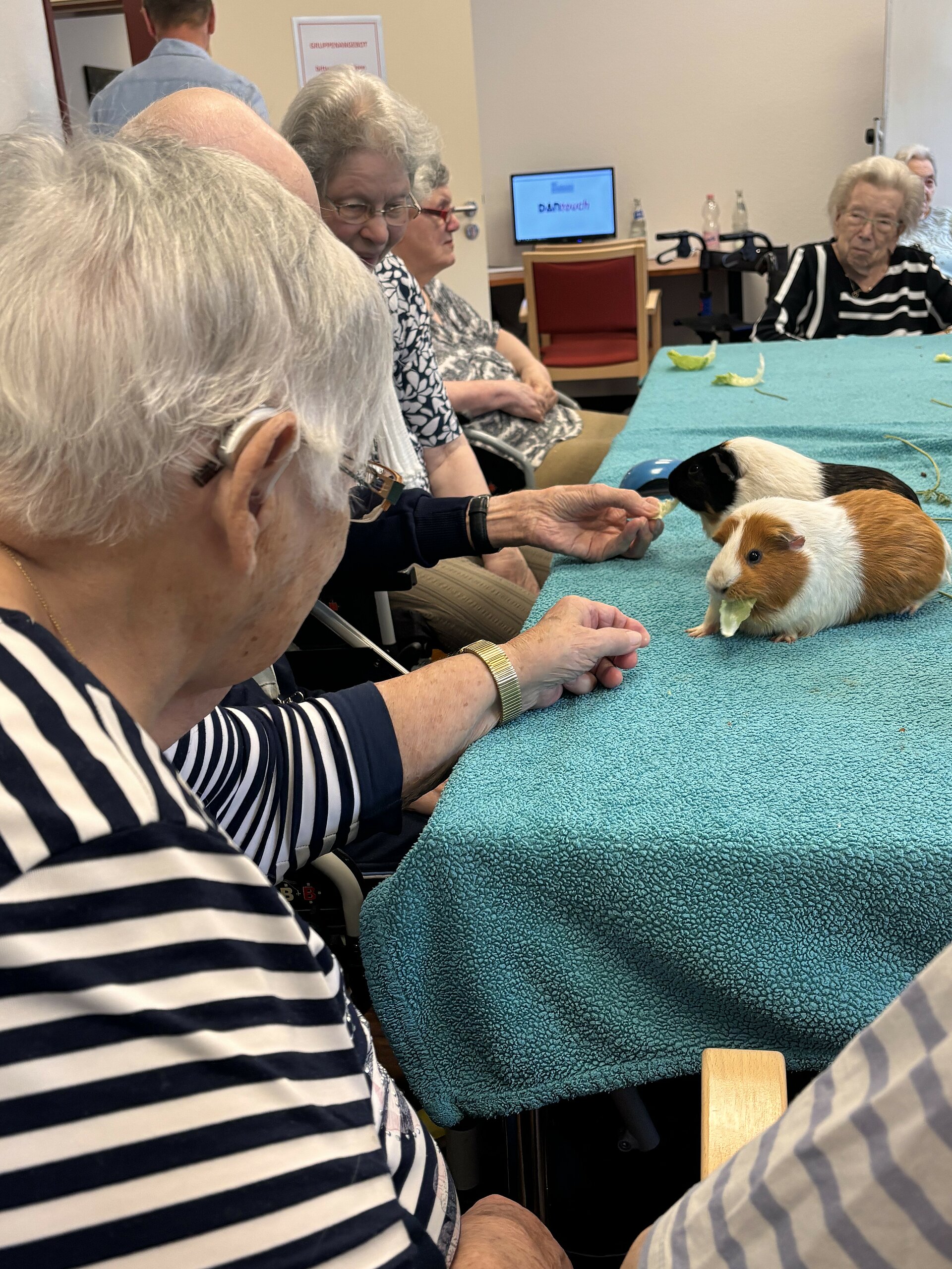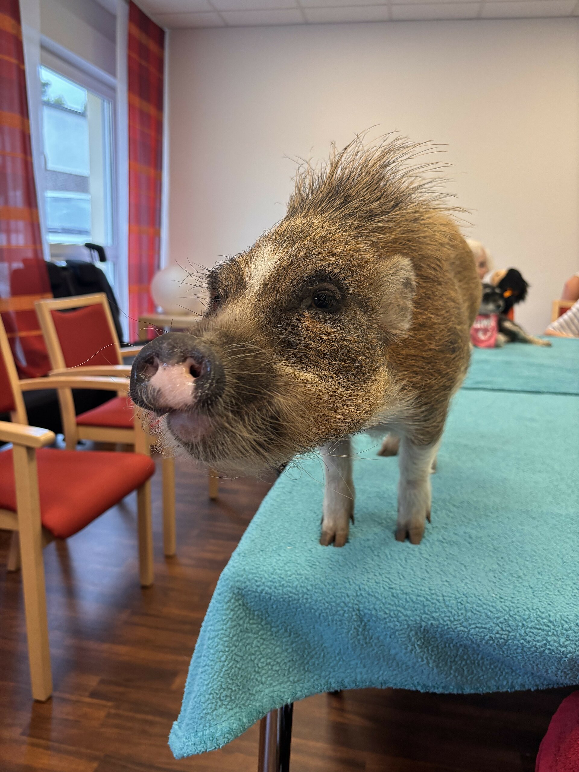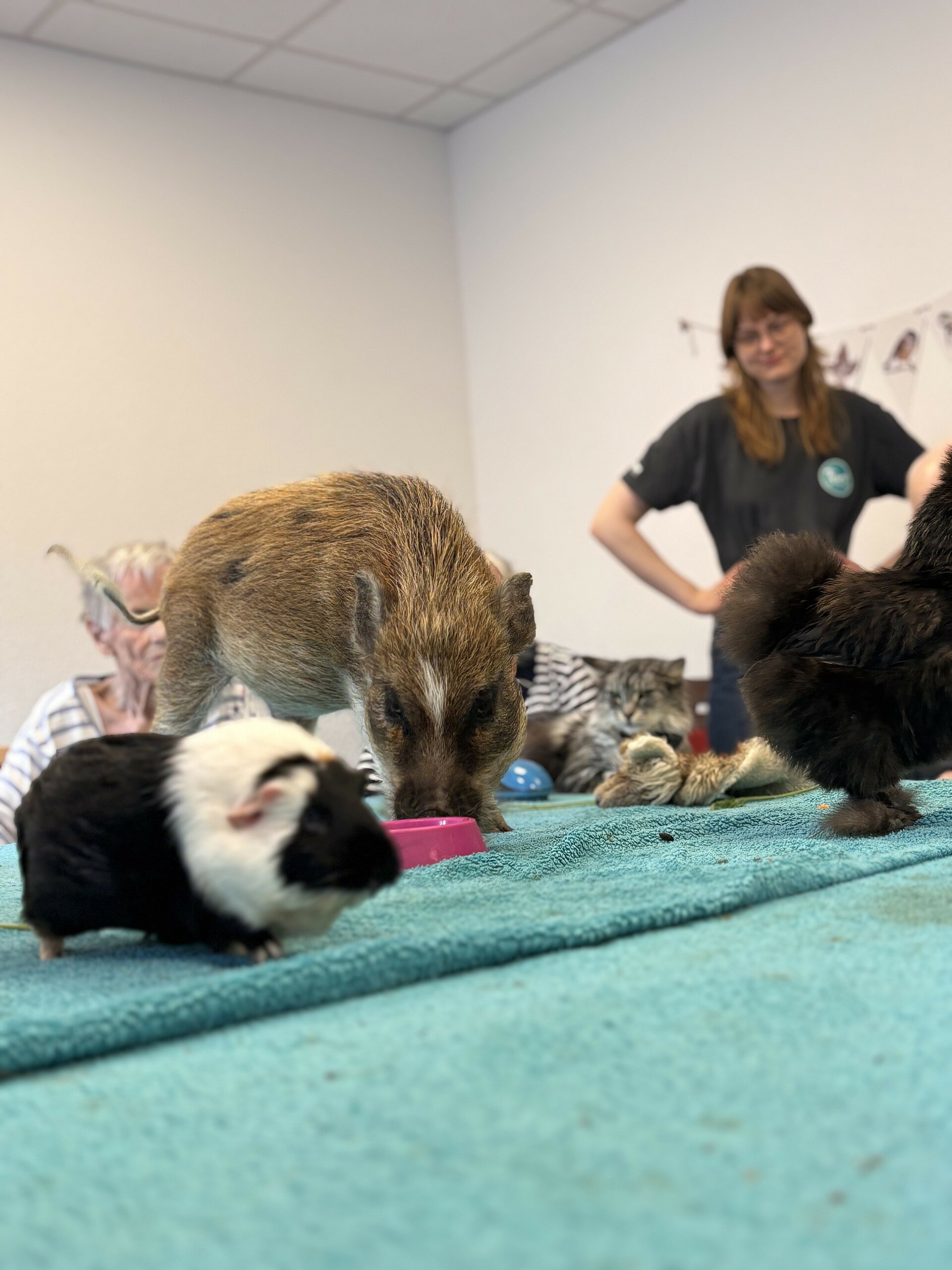 Am vergangenen Donnerstag durften unsere Bewohner*innen einen ganz besonderen Tag erleben, als eine bunte Mischung aus Tieren aus der Tiertherapie zu uns kam: Hunde, Hühner, Hasen, Katzen und sogar ein Hausschwein. Der Besuch fand in unserem gemütlich vorbereiteten Gruppenraum statt, wo die Tiere auf Tischen umherlaufen konnten. Diese speziell vorbereiteten Flächen gaben den Tieren genug Raum, sich frei zu bewegen, während sie gleichzeitig sicher und nahe bei den Bewohner*innen waren. Besonders das Hausschwein, das mit seiner eher schüchternen, aber dennoch zutraulichen Art das Herz der Bewohner*innen im Sturm eroberte, war ein Highlight des Nachmittags. Es wühlte neugierig und freundlich auf den Tischen, bis es den Kontakt zu den Bewohner*innen suchte – und sofort in den Händen vieler ein neues Zuhause fand. Das Streicheln des kleinen Schweins sorgte für ausgelassene Freude und viel Lächeln.