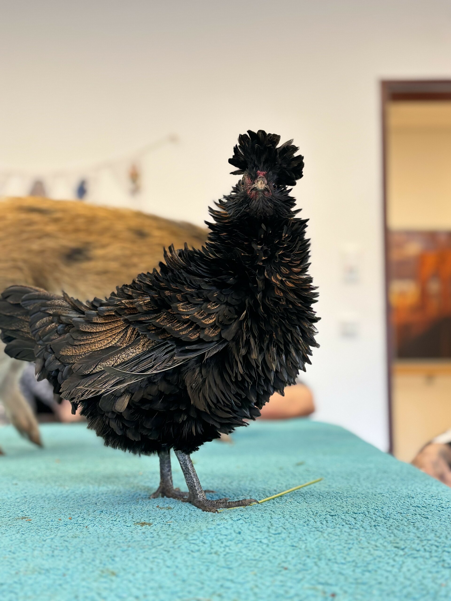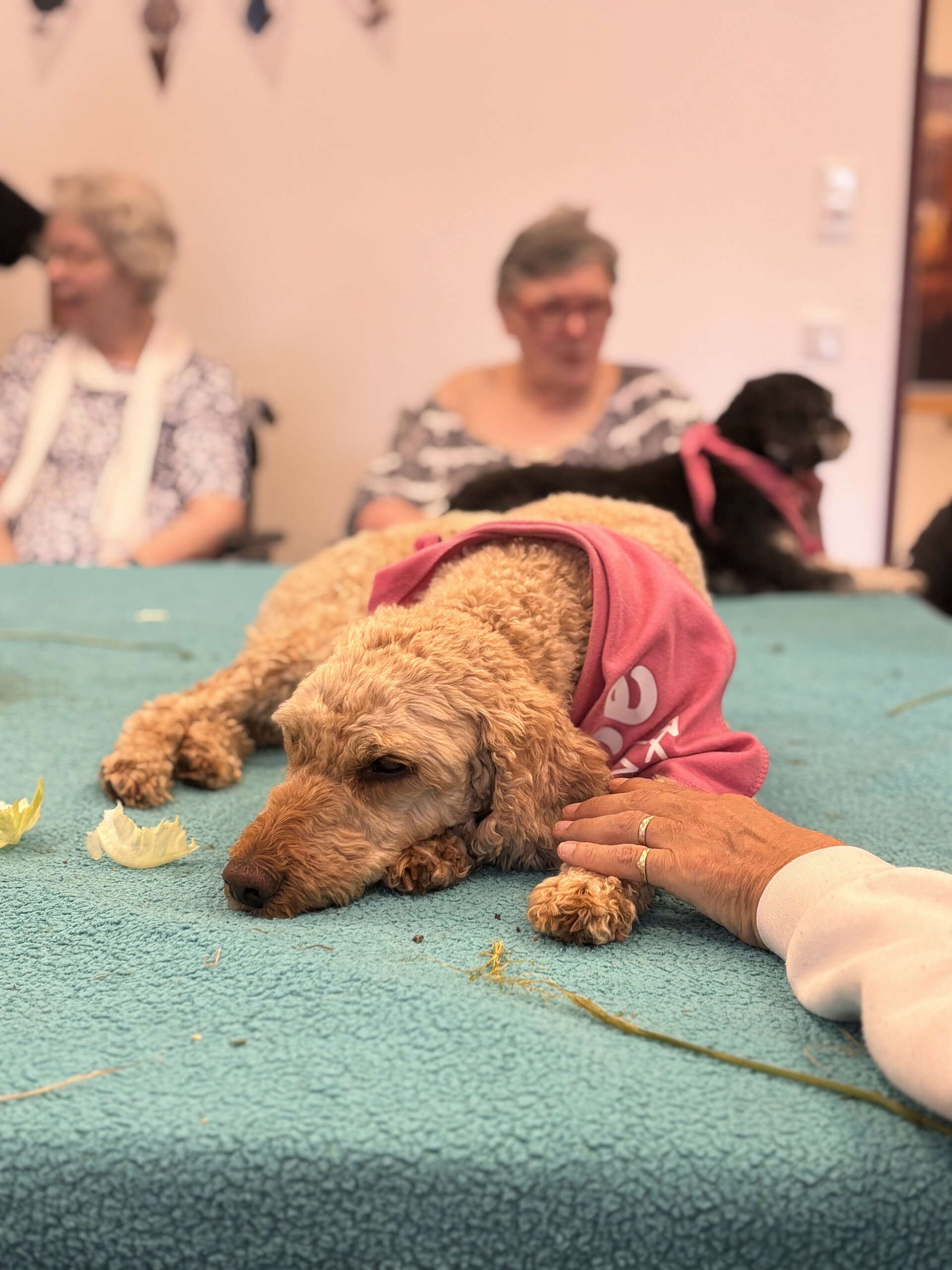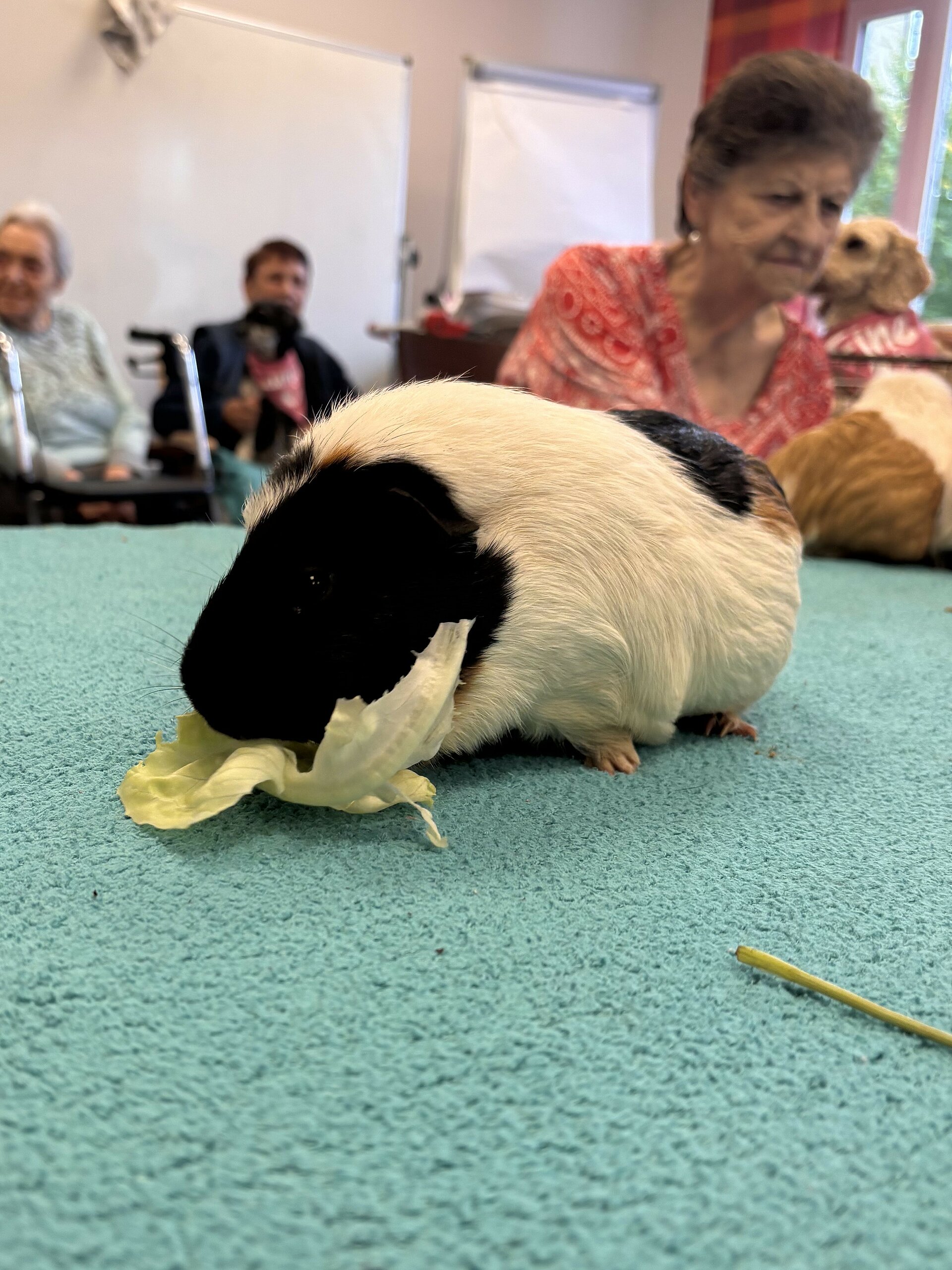 Am vergangenen Donnerstag durften unsere Bewohner*innen einen ganz besonderen Tag erleben, als eine bunte Mischung aus Tieren aus der Tiertherapie zu uns kam: Hunde, Hühner, Hasen, Katzen und sogar ein Hausschwein. Der Besuch fand in unserem gemütlich vorbereiteten Gruppenraum statt, wo die Tiere auf Tischen umherlaufen konnten. Diese speziell vorbereiteten Flächen gaben den Tieren genug Raum, sich frei zu bewegen, während sie gleichzeitig sicher und nahe bei den Bewohner*innen waren. Besonders das Hausschwein, das mit seiner eher schüchternen, aber dennoch zutraulichen Art das Herz der Bewohner*innen im Sturm eroberte, war ein Highlight des Nachmittags. Es wühlte neugierig und freundlich auf den Tischen, bis es den Kontakt zu den Bewohner*innen suchte – und sofort in den Händen vieler ein neues Zuhause fand. Das Streicheln des kleinen Schweins sorgte für ausgelassene Freude und viel Lächeln.