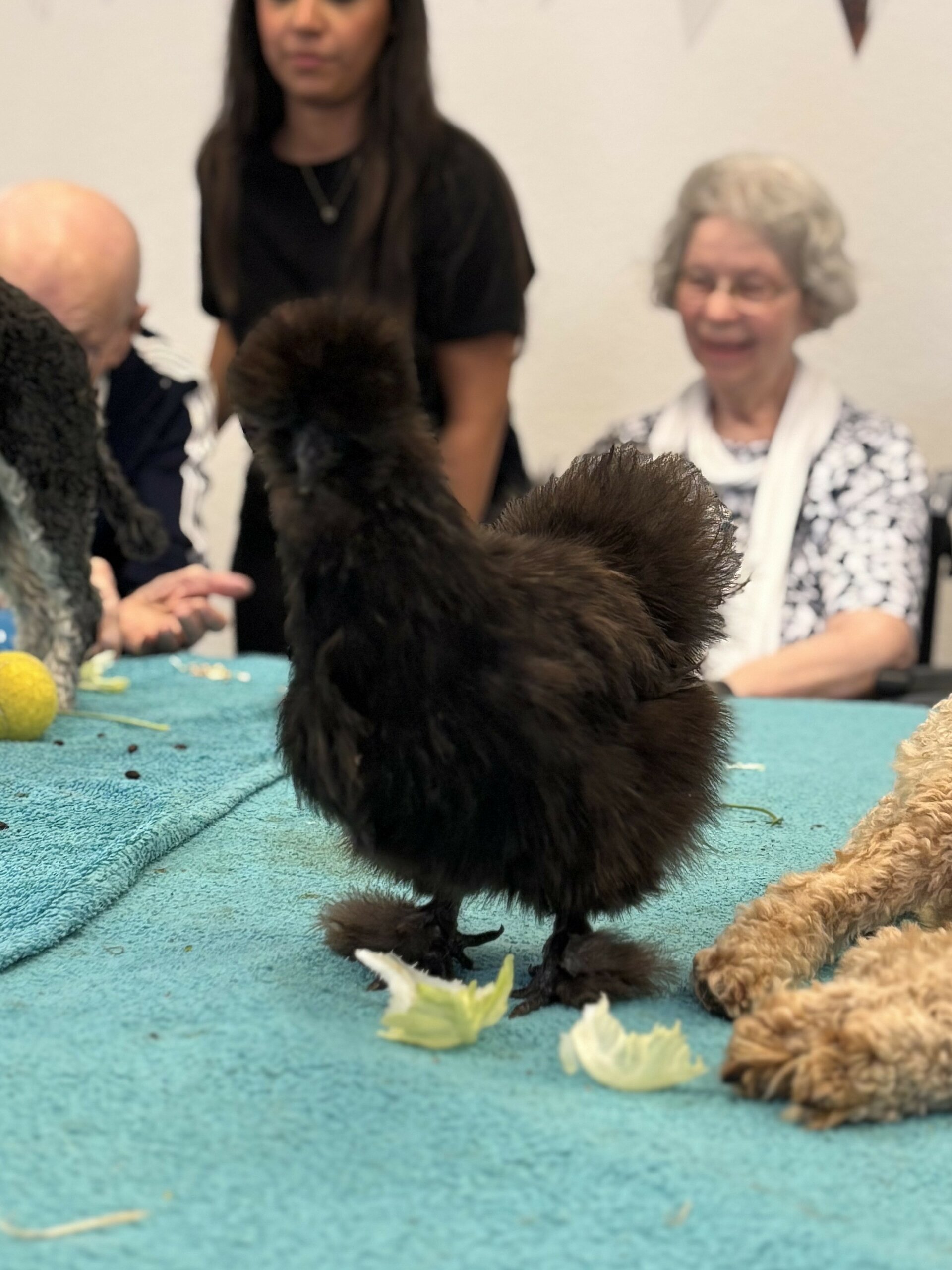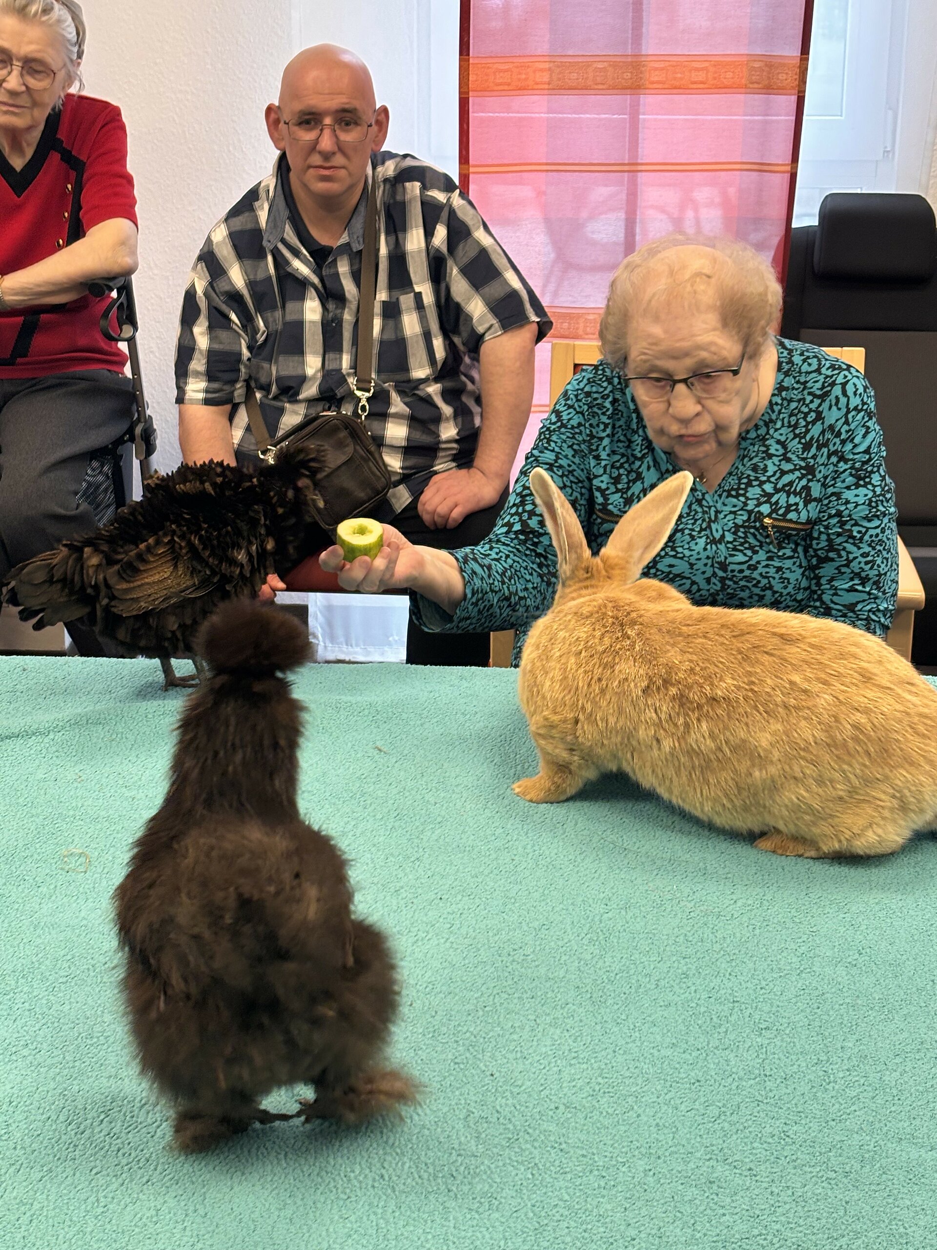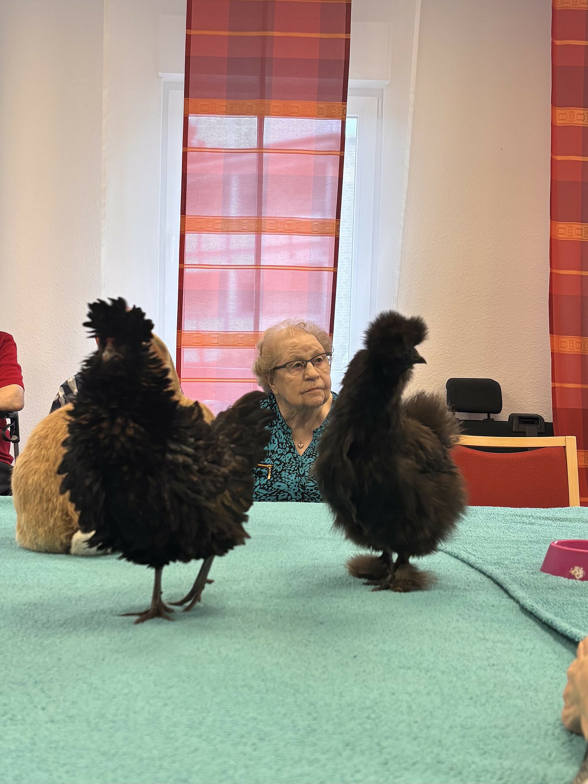 Aber auch die anderen Tiere trugen ihren Teil dazu bei, dass der Tag zu einem echten Erlebnis wurde. Die Hunde, die sich auf den Tischen zu den Bewohner*innen begaben, wurden sofort in Empfang genommen. Mit ihrer freundlichen Art forderten sie zum Kuscheln und Streicheln auf. Die Hühner und Hasen, die sich ebenfalls frei bewegten, weckten Erinnerungen an ländliche Kindheitstage und sorgten für heitere Gespräche und die Katze, die es liebt, sich in der Nähe von Menschen aufzuhalten, fand schnell ihren Lieblingsplatz auf den Tischen, um sich streicheln zu lassen.