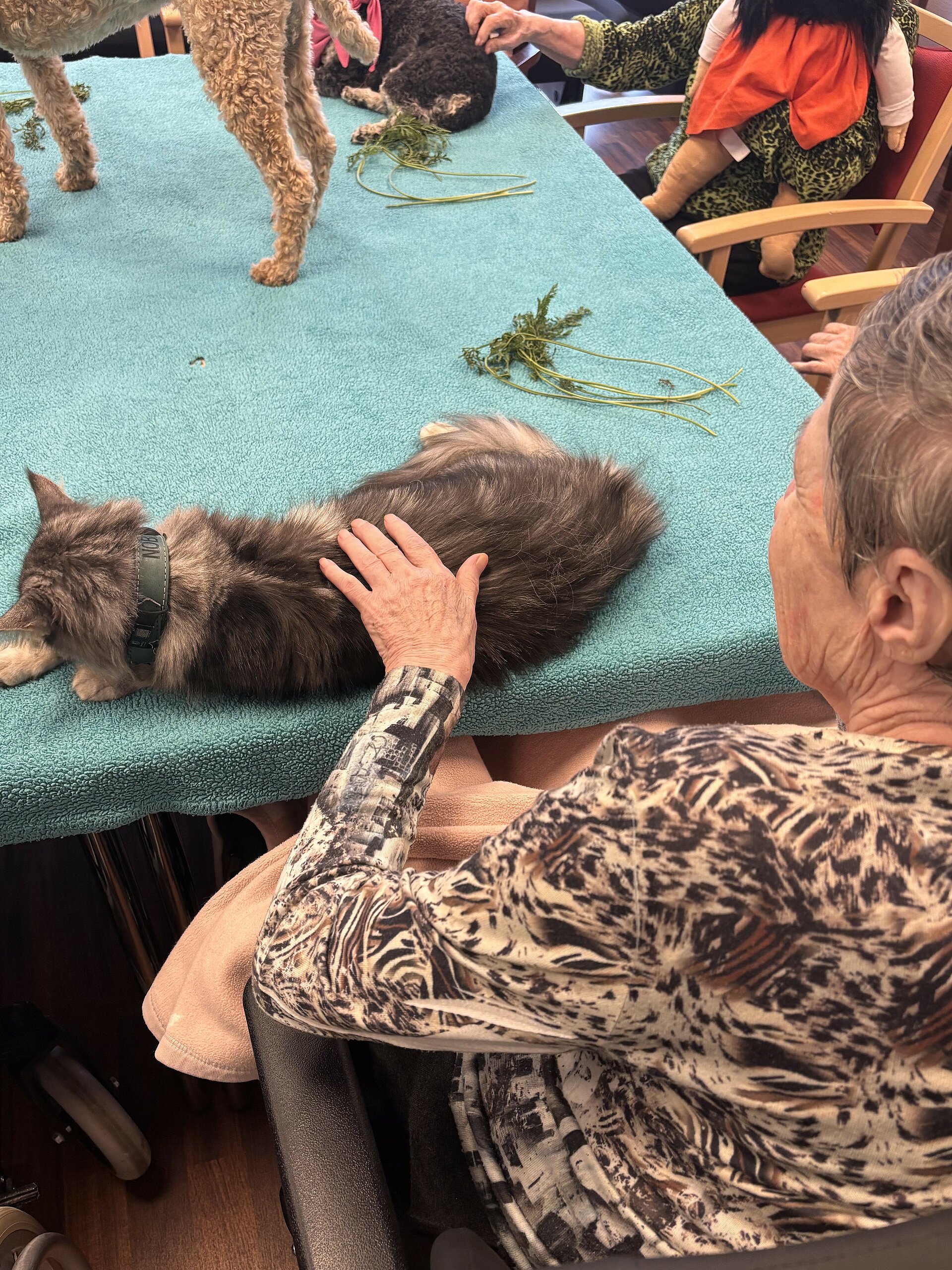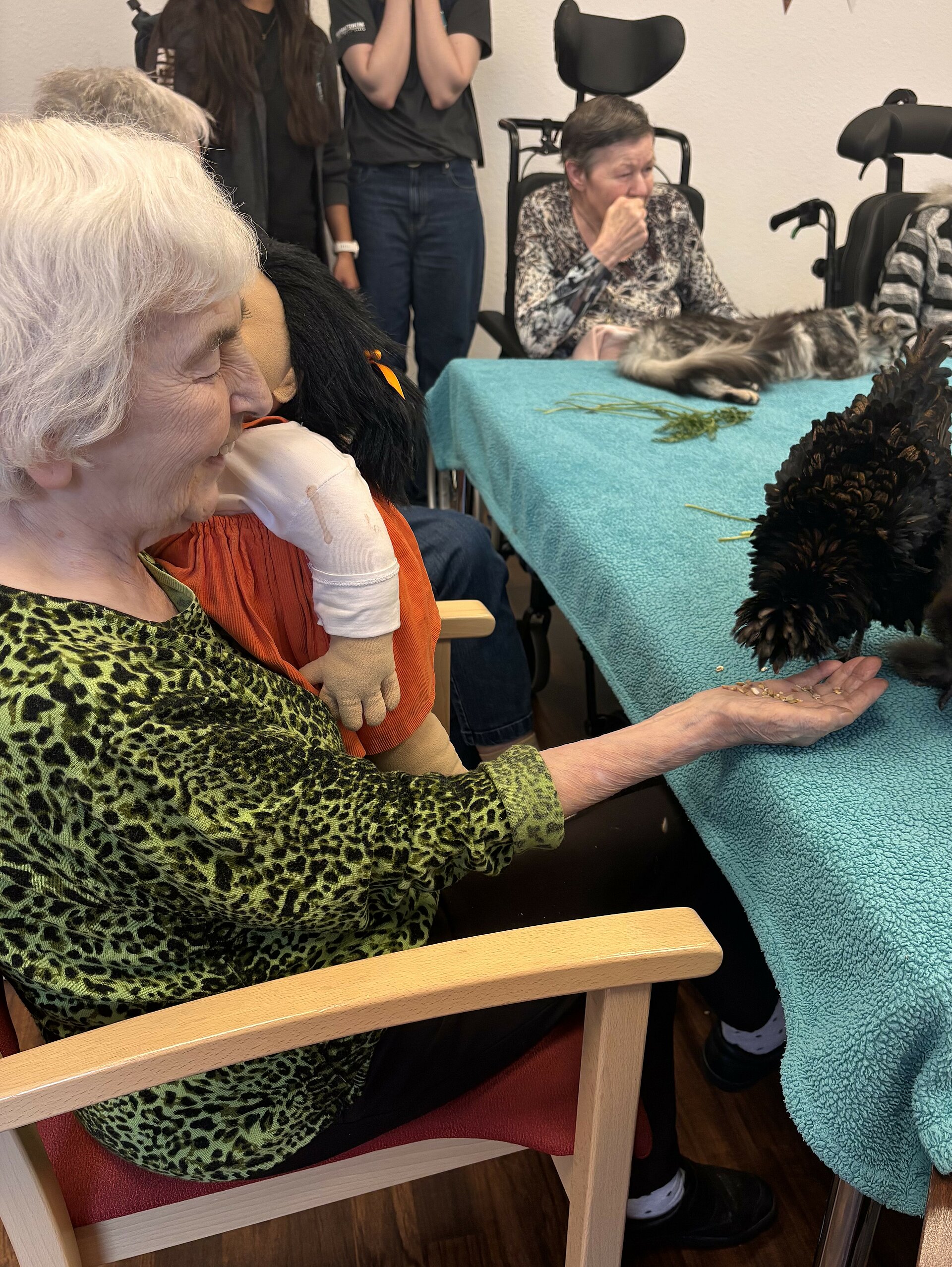 Was diesen Besuch so besonders machte, war nicht nur der Kontakt mit den Tieren, sondern auch die Erinnerungen, die dadurch geweckt wurden. Viele unserer Bewohner*innen erinnerten sich an die Tiere, die sie in ihrer Jugend oder im Erwachsenenalter gehalten hatten – Hunde, Katzen, Pferde und viele mehr. Der Umgang mit Tieren war für viele ein zentraler Bestandteil ihres Lebens, der oft aus Zeitgründen oder anderen Umständen in den Hintergrund gerückt war.