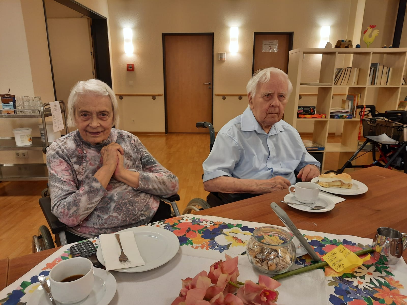 Es war mal wieder Zeit unsere "Geburtstagskinder" der letzten Monate an einem Tisch zu versammeln und gemeinsam anzustoßen! Mit Kuchen, Kaffee und obligatorischem Sektempfang wurde viel gelacht und geklönt - dazu gab es Wunschmusik aus Swing, Tango & Schlagern. Aber "nur" eine 100-jährige am Tisch war uns nicht genug, später gesellte sich auch unser ältester Bewohner ebenfalls mit 100 Jahren zu uns dazu! Noch mehr Lebenserfahrung und Humor an einem Tisch war fast nicht zu schlagen! Wir freuen uns schon auf das nächste Mal.