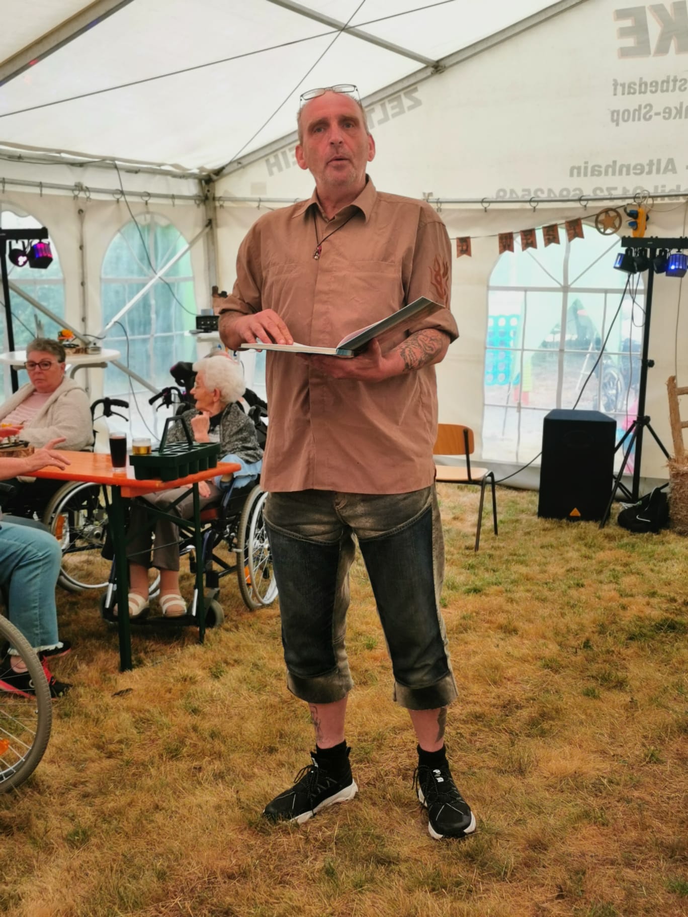 Wie in jedem Jahr, eröffnete unser Einrichtungsleiter Herr L. Pereira de Lima unser Fest mit ein paar Worten an unsere Bewohner und Gäste, sowie Freunde des Hauses. Unser Pfarrer Holger Kötz übernahm dann das Programm und hielt einen Gottesdienst ab, den unsere Bewohner auch immer sehr genießen, bevor die Party dann richtig in Schwung kam. Wochen vor unserem Fest, haben unsere Goldborn Singer's fleißig geübt, um unser neustes Stück zu präsentieren. Auf die bekannte Melodie von Truck Stop wurde ein neuer Text geschrieben, der unser Haus und Personal, sowie das gemeinsame Zusammenleben bei uns beschreibt. Die Küche hat für das leibliche Wohl gesorgt, mit allerlei köstlichen Speisen vom Kaffee bis hin zum Abendessen wurden alle reichlich verwöhnt. Nun wurden unsere Outdoor Spiele gestartet und es gab an jeder Station etwas zu gewinnen. An dieser Stelle nochmal ein herzliches Dankeschön an Ferrero, die uns zu jedem Fest tolle Preise spenden.