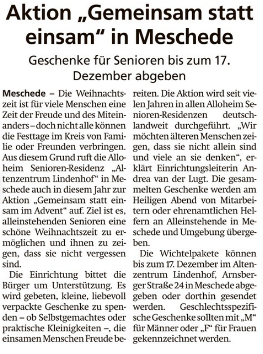 Deshalb startet das Altenzentrum Lindenhof auch 2025 wieder die Aktion „Gemeinsam statt einsam im Advent“. Wir sammeln liebevoll verpackte Geschenke für alleinstehende Senioren in Meschede und Umgebung, um ihnen zu zeigen, dass sie nicht vergessen sind.