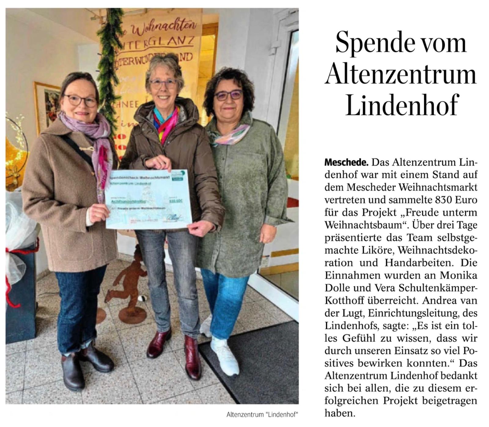 Wir freuen wir uns, die stolze Summe von 830€ an das Projekt „Freude unterm Weihnachtsbaum“ übergeben zu können! Die Einnahmen trugen dazu bei, diese erfreuliche Summe zu erreichen. Im Rahmen der Aktion konnte die Spende offiziell an Monika Dolle und Vera Schultenkämper-Kotthoff überreicht werden.