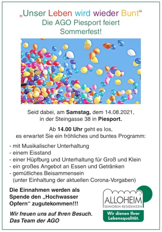 Am Samstag, dem 14.08.2021, ab 14 Uhr feiert das AGO Piesport sein Sommerfest mit buntem Programm.