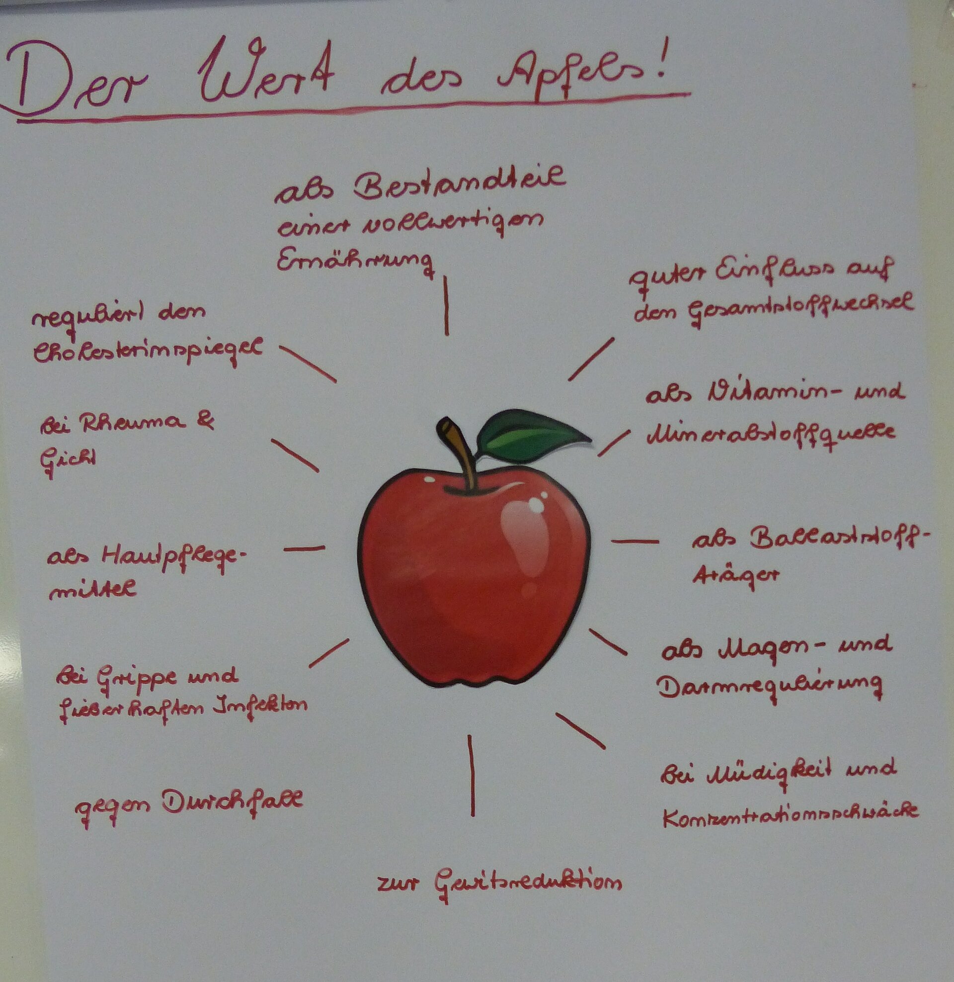 Zusammen wurde überlegt, welche Vorzüge Äpfel haben: hilft bei Durchfall, senkt den Cholesterinspiegel, hilft bei der Gewichtsreduktion, ist gut für die Haut usw.